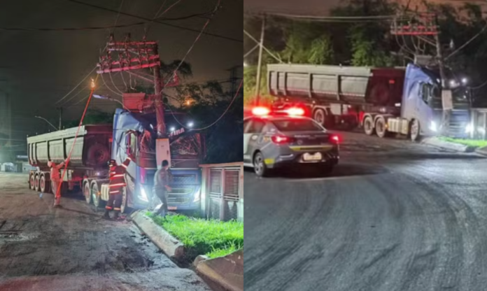 Um video obtido pelo Cubatão Notícias mostra o caminhão batido contra um poste.